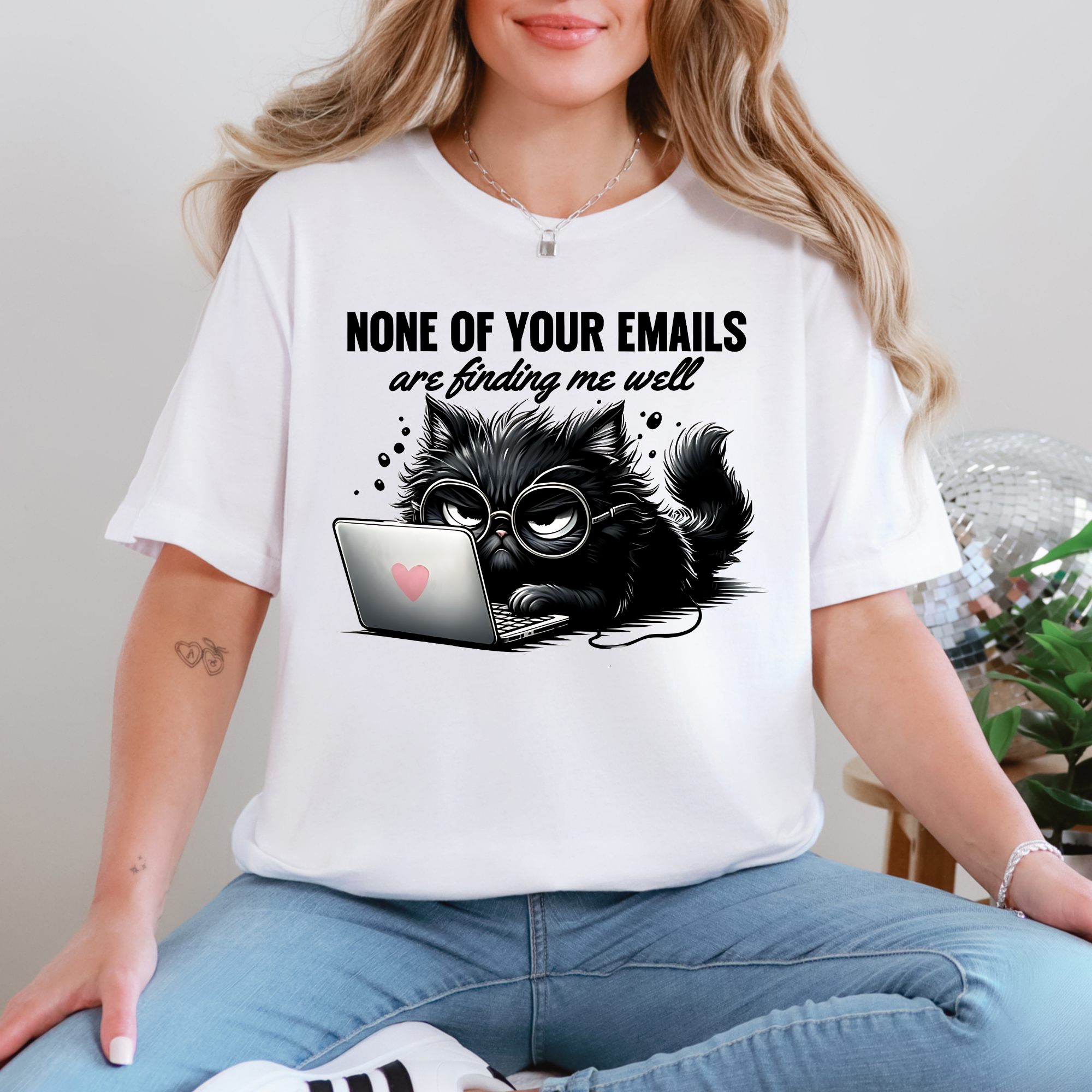 Make a statement without saying a word in our 'None of Your Emails Are Finding Me Well' cat graphic tee. Featuring a grumpy, laptop-loving kitty, this soft and comfy shirt is perfect for anyone who’s over the inbox and ready for cozy, casual vibes.
