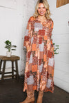 This dress is giving all the fall vibes with its pretty patchwork print. It’s a long length with a fit and flare cut that moves so nicely when you walk. It is a buttery soft fabric. The long sleeves have a slight puff with elastic at the wrist, and the collared neckline gives it a polished touch. This dress also has side pockets.