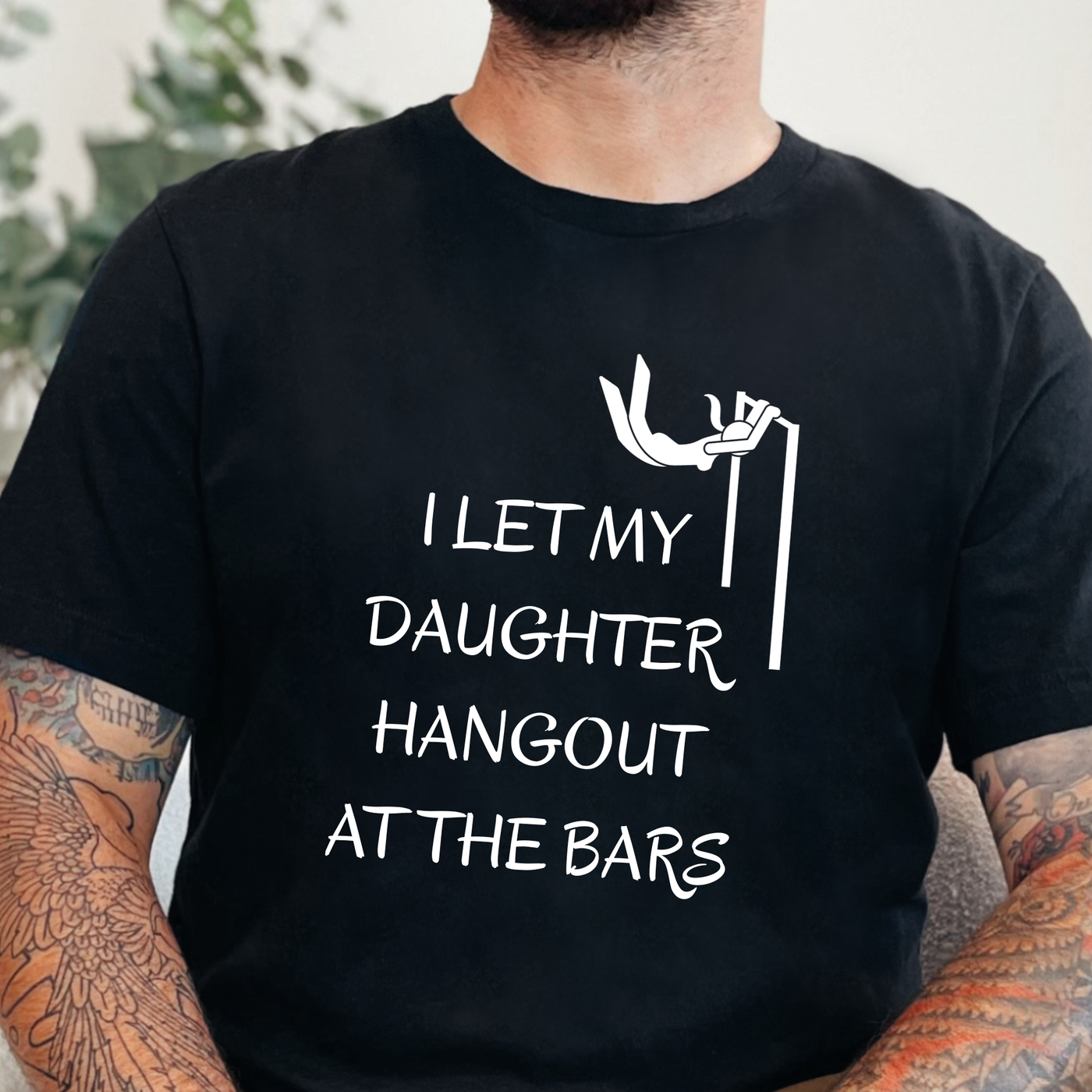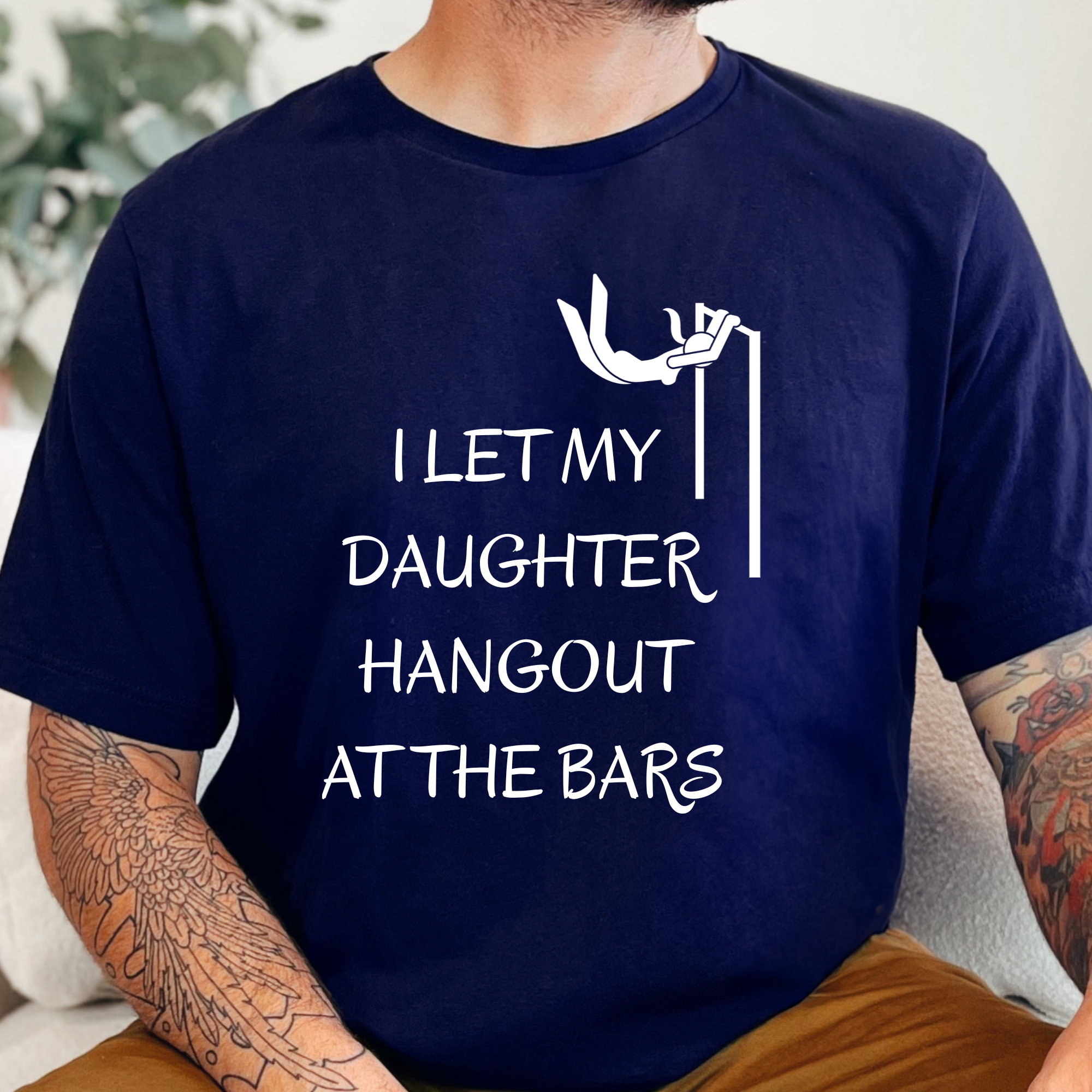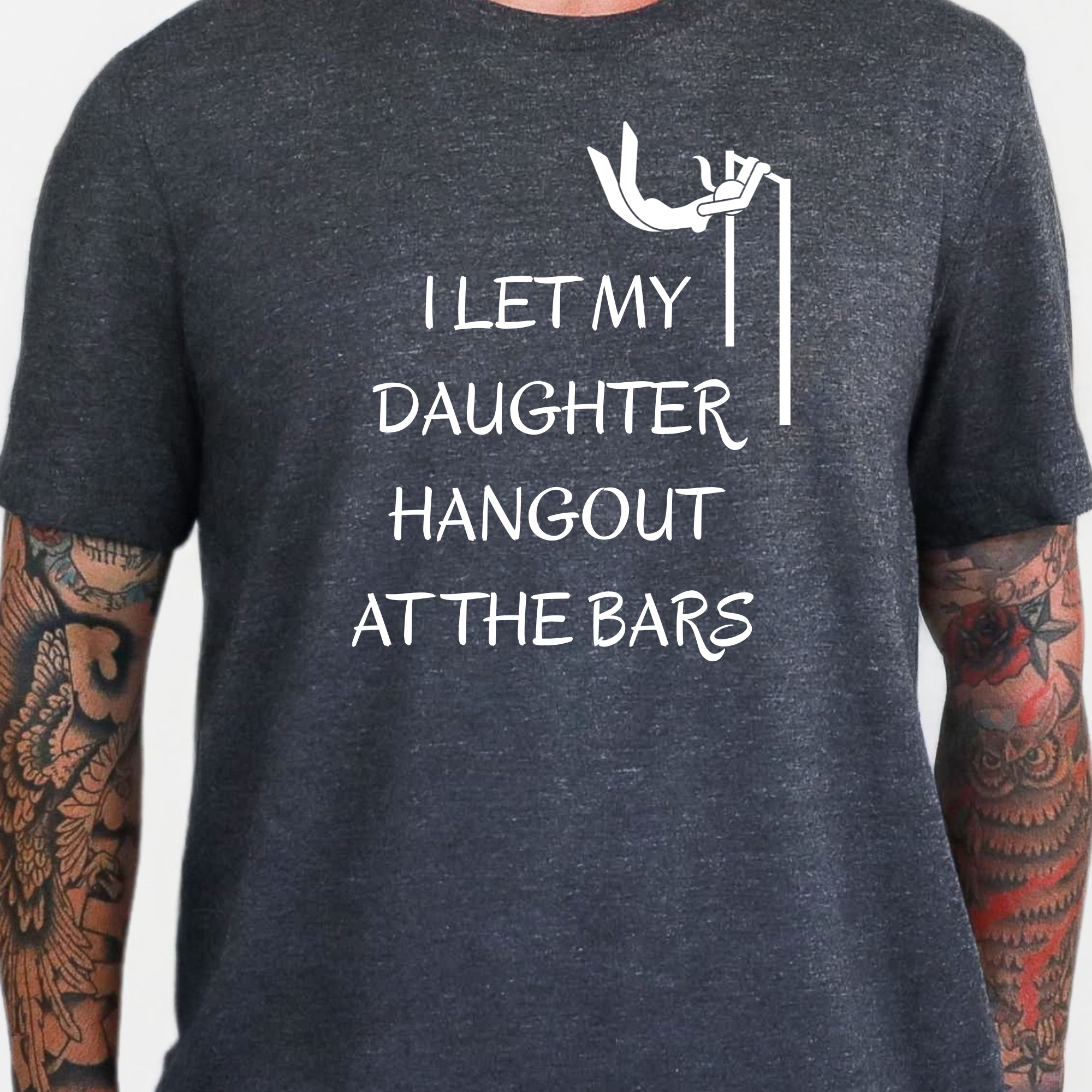A funny and relatable graphic tee featuring the phrase “I Let My Daughter Hang Out At The Bars” with a playful gymnastics-inspired design. Perfect for proud girl dads, gymnastics parents, and anyone who appreciates a clever double meaning.