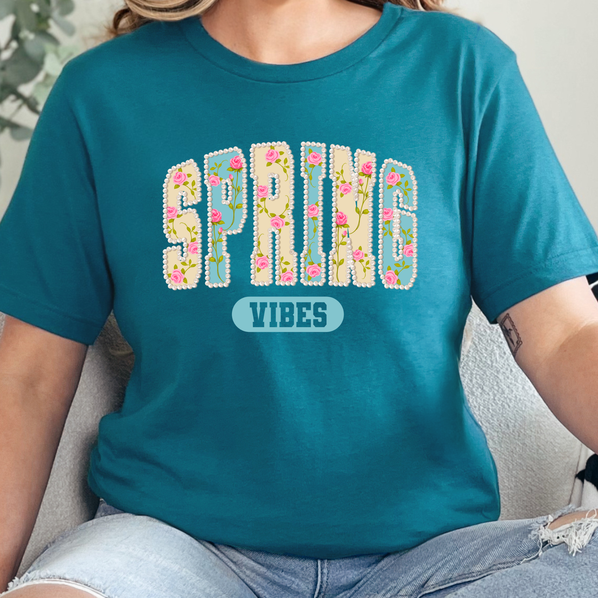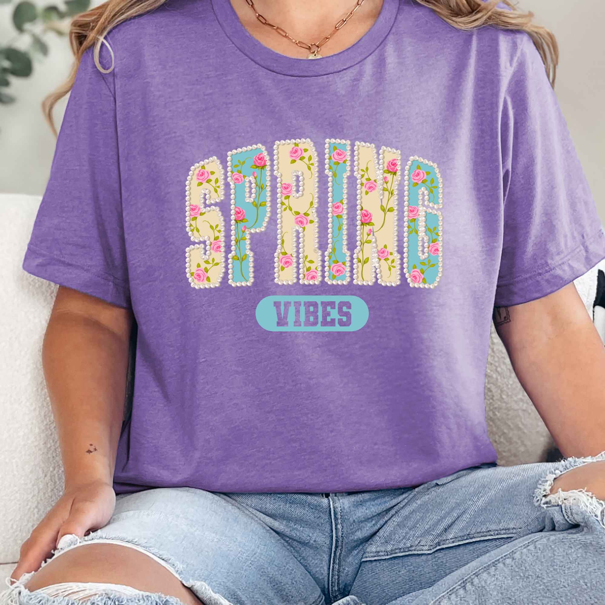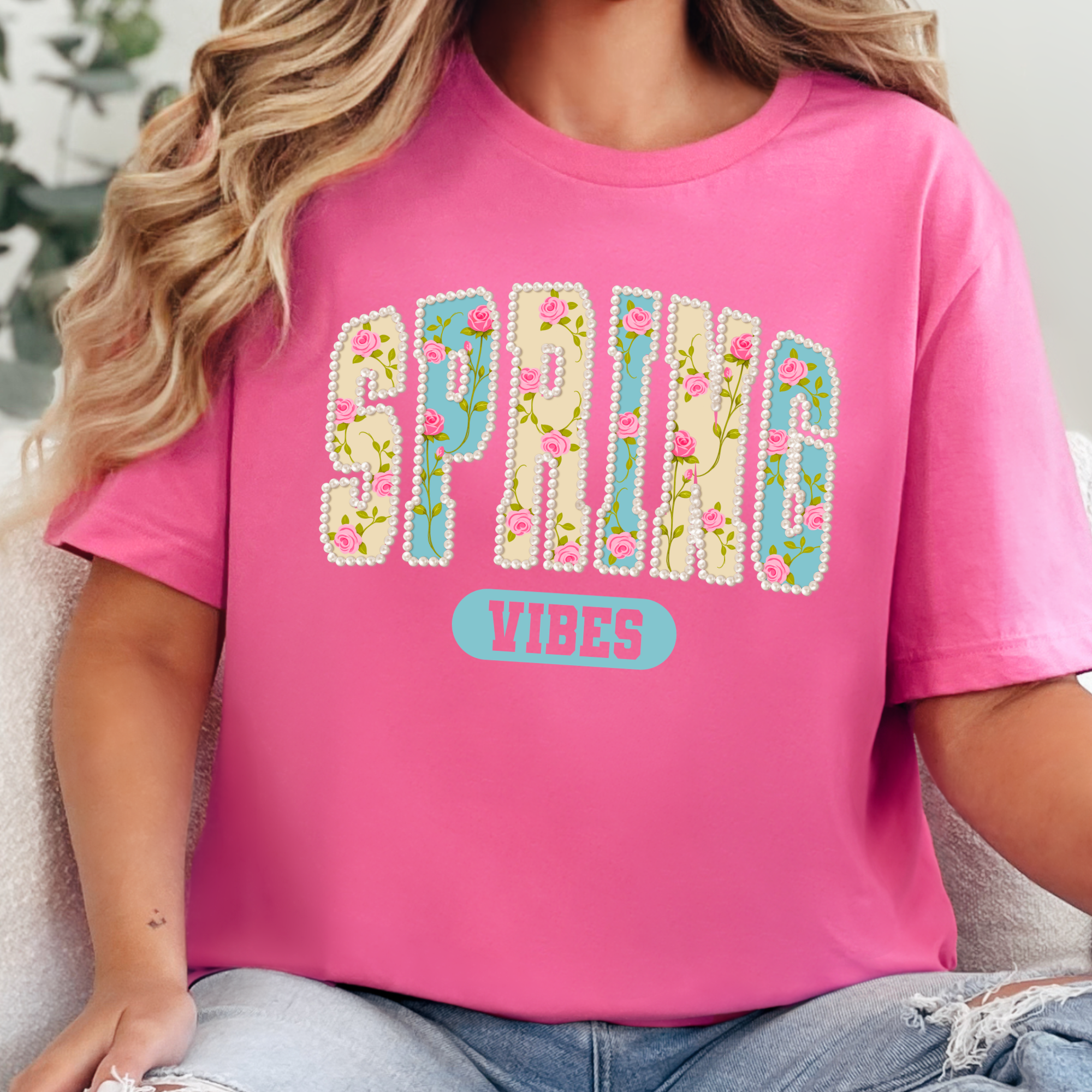 A fresh and feminine graphic tee featuring “Spring Vibes” in floral-filled lettering with soft pastel accents. This bright, seasonal design captures the feel of spring and adds a cheerful pop of color to any boutique collection.