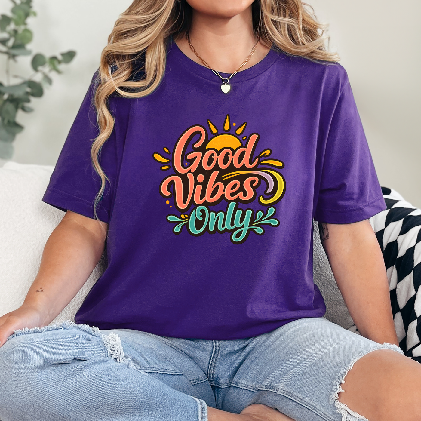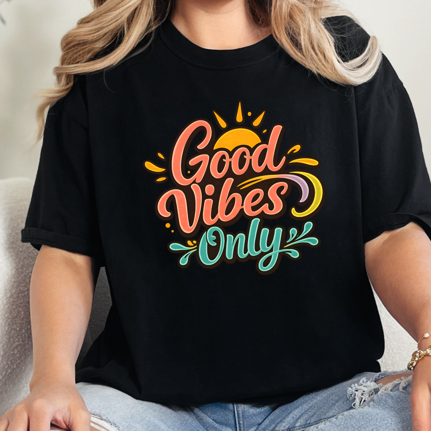 A bright and uplifting graphic tee featuring the phrase “Good Vibes Only” in a fun, colorful design. This feel-good style brings positive energy to any outfit, making it an easy go-to piece for everyday wear.