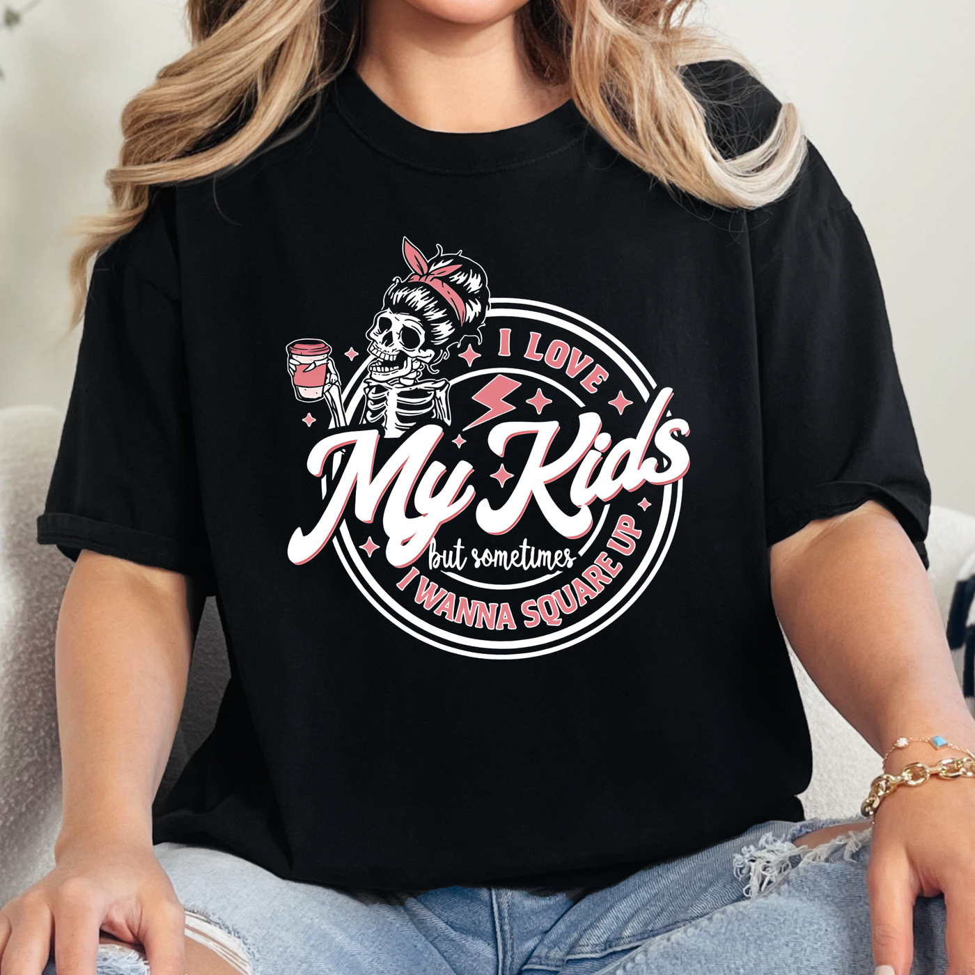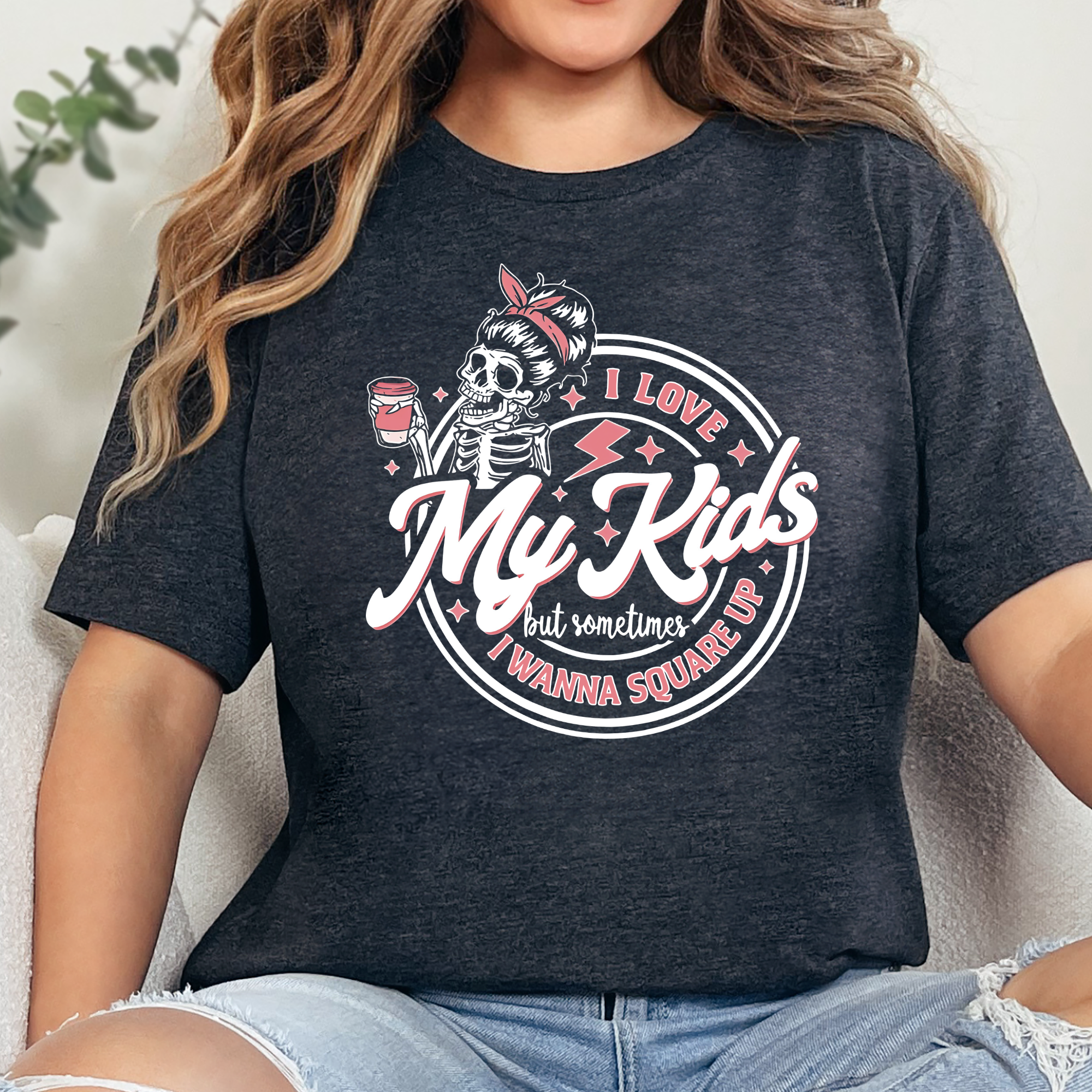 This bold tee features a fun skeleton graphic with the phraseĀ āI Love My Kids⦠But Sometimes I Wanna Square Up.ā Perfect for parents who keep it real and laugh through the chaos.