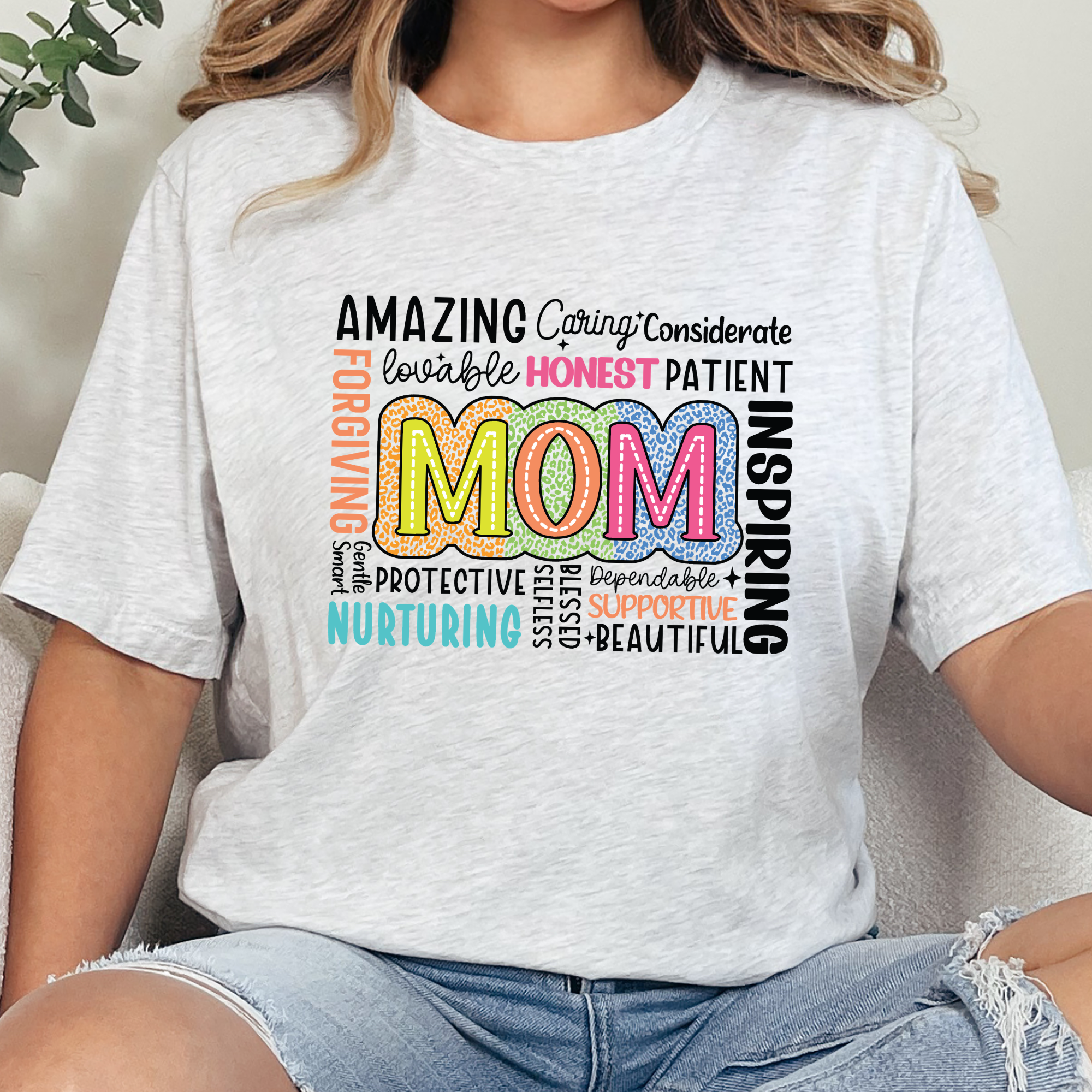 Celebrate the heart of it all š This colorfulĀ āMomā tee is filled with all the words that describe her bestāloving, patient, nurturing, inspiring, and so much more. A perfect everyday reminder of just how amazing moms truly are.