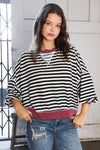 This top is such a fun take on stripes, with the black and white on the front and the ribbed detailing on the back. It’s got that loose, relaxed fit that just feels comfy and easy to wear. The fabric is soft and has stretch.