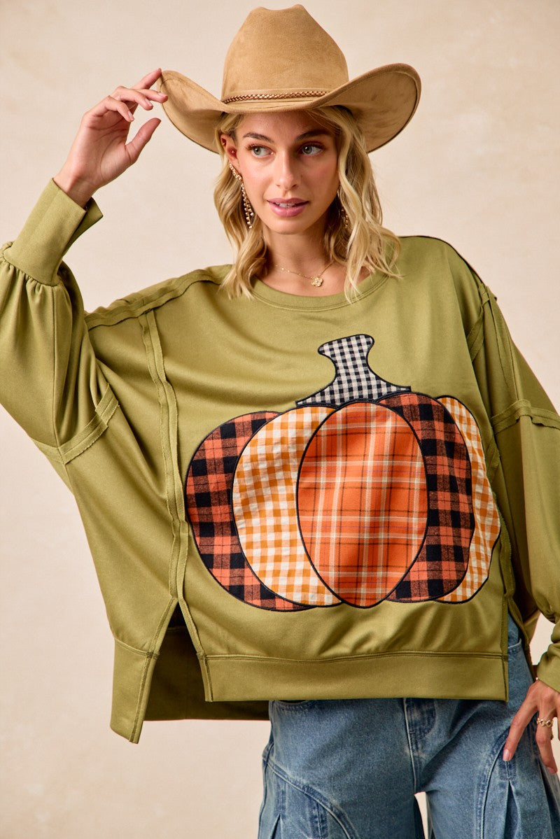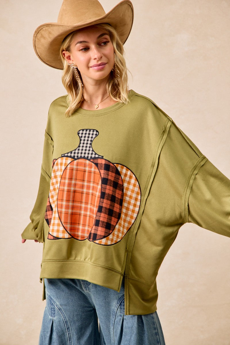 BiBi Plaid Mix Pumpkin Patchwork Cut Edge Detail Oversized French Terry Sweatshirt from Broadway & Arthur Boutique.