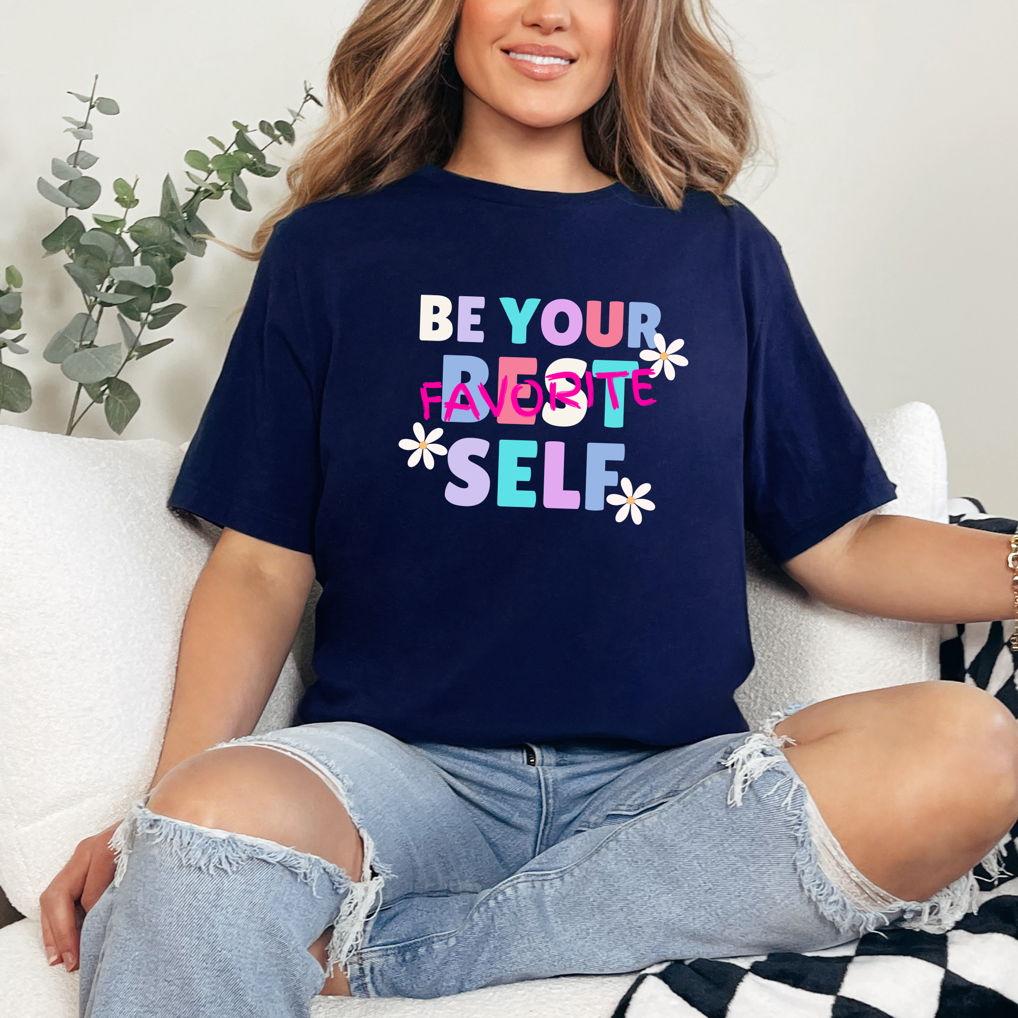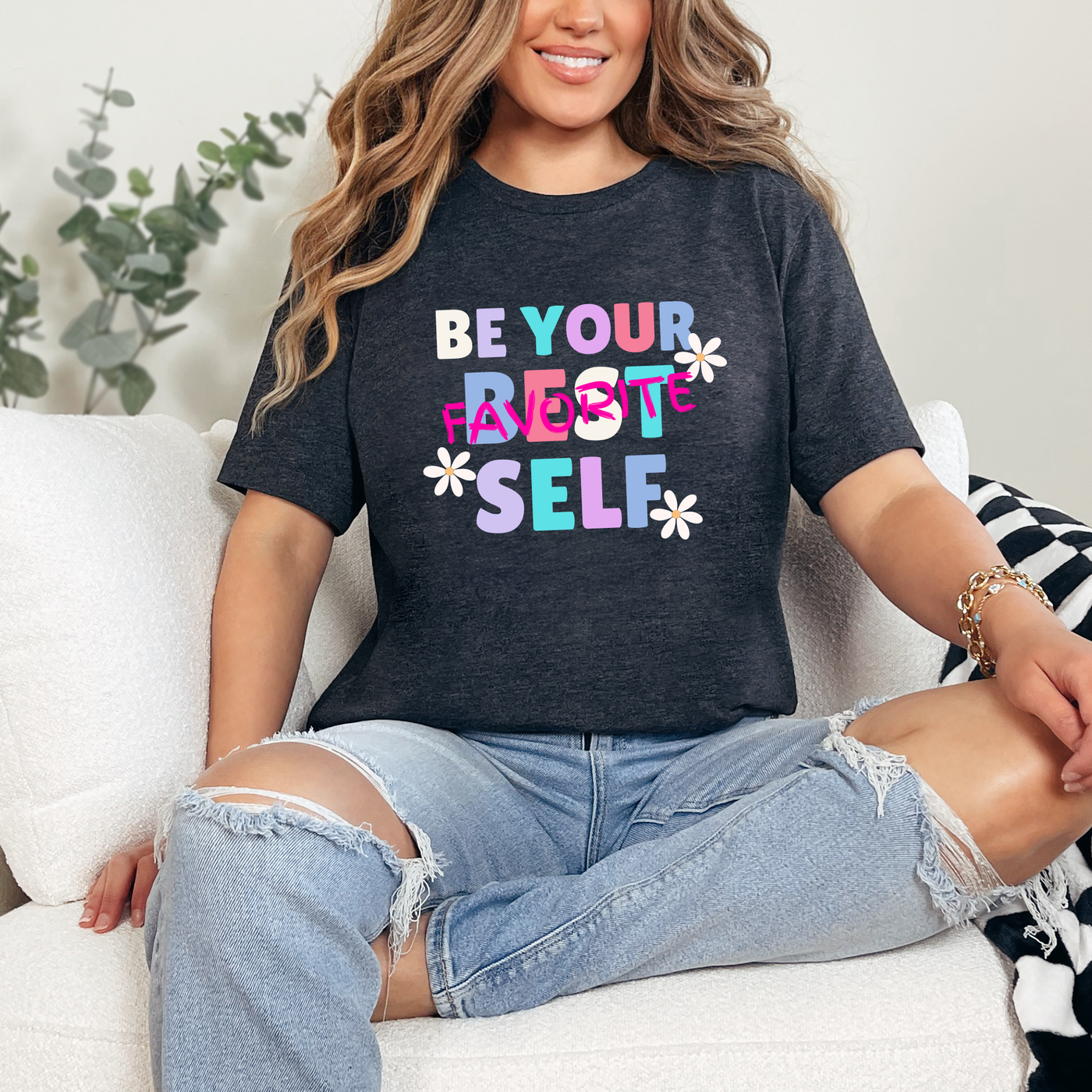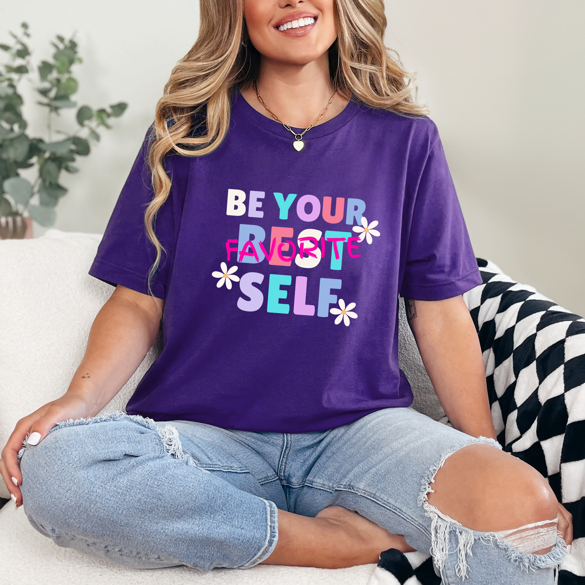 A colorful reminder to show up as your best self every day 🌼 This uplifting tee features the playful phrase “Be Your Favorite Self” with cheerful colors and daisy accents for a fun, feel-good look.