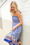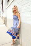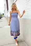 Look more than lovely in this Boho and border print midi dress that features a smoked yoke and dainty shoulder straps. Simply sublime with a flattering drape!