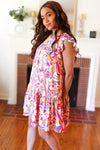 Donning a unique geo print design, this round neck dress with a ruffle hemline and flutter sleeves is the perfect addition to your summer wardrobe. Side pockets, buttery smooth, stretchy knit and plenty of swing complete this stunner.