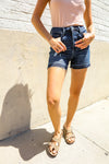 Get ready for warm weather and summer fun with these high-rise dark wash denim shorts with a tummy control design and trendy released hem. Functional front and back pockets complete these flattering shorts with plenty of stretch. Pair with sandals or sneakers.