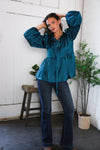 This satin top is such a pretty statement piece. The deep teal color is perfect for fall but it works great for the holidays as well! It’s got three sweet little bow ties down the front that give it a feminine and cute touch. The fabric has that smooth, silky feel that drapes so nicely. The flowy fit is comfortable and still looks polished. We like pairing it with dark denim and boots for a dinner out..