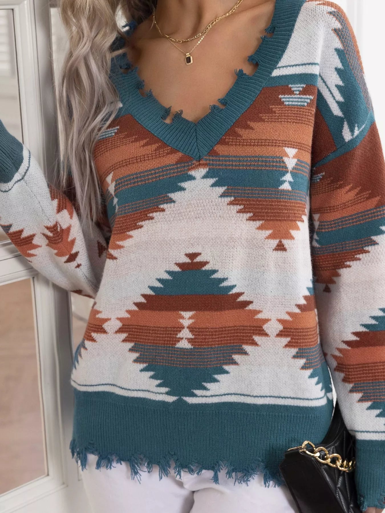 Geometric Frayed Hem V-Neck Long Sleeve Sweater from Broadway & Arthur Boutique.